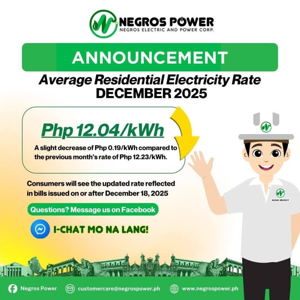 Negros Power’s December 2025 electricity rates bring a welcome relief to consumers for the holidays, especially after Negros Occidental endured months marked by successive calamities and disruptions. The good news is that households will pay a lower average residential rate of ₱12.0441 per kilowatt-hour this December, down by ₱0.1881 per kWh from November’s ₱12.2322 per kWh. This translates into meaningful savings for many families. The reduced power cost comes at an opportune time, helping ease household budgets as residents juggle higher expenses for food, travel, and holiday celebrations during the Christmas season. More details below.